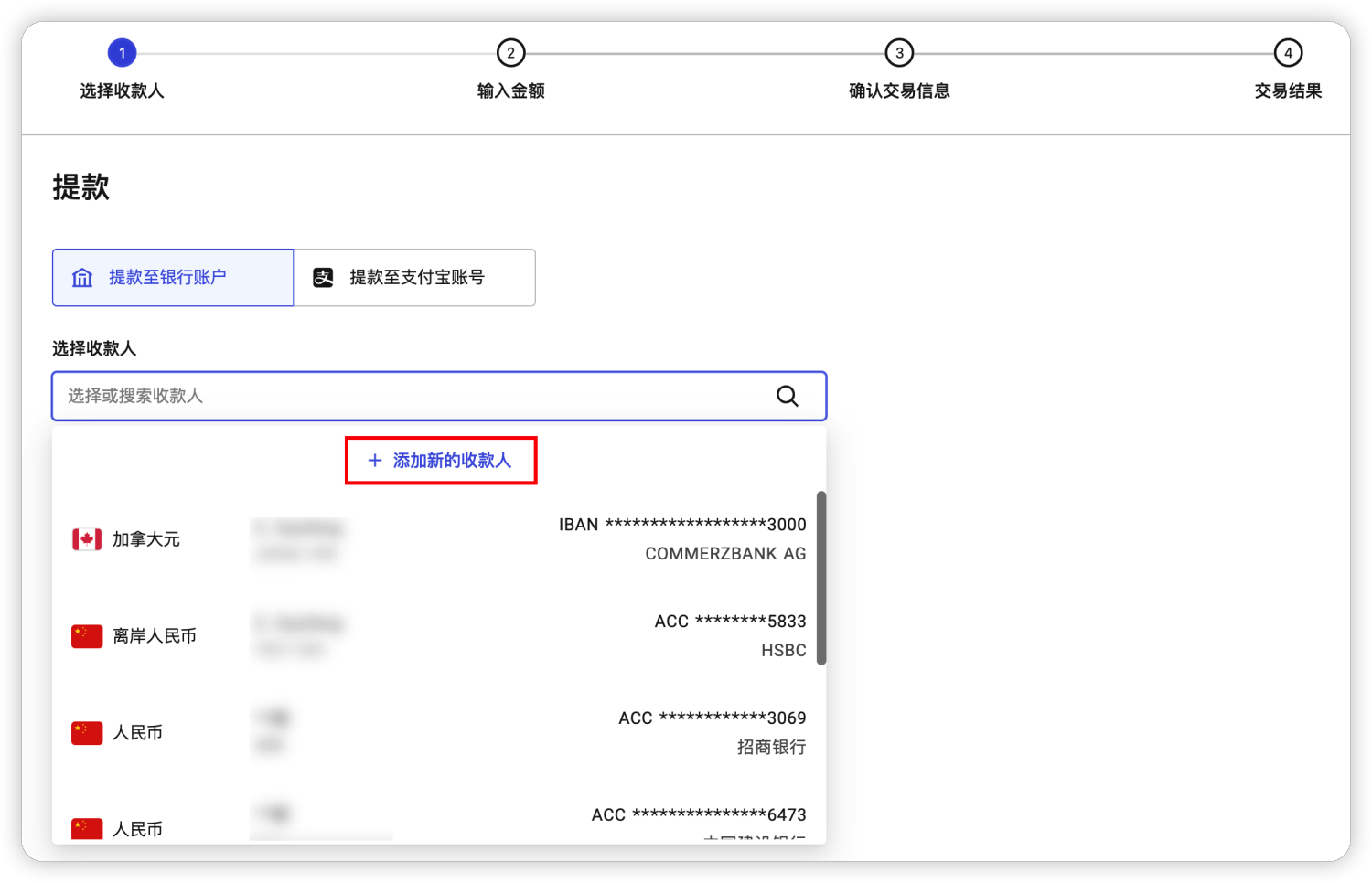 选择【单个添加收款人】,您可以添加您自己的银行卡账户或支付宝,也可以添加第三方银行卡或支付宝。