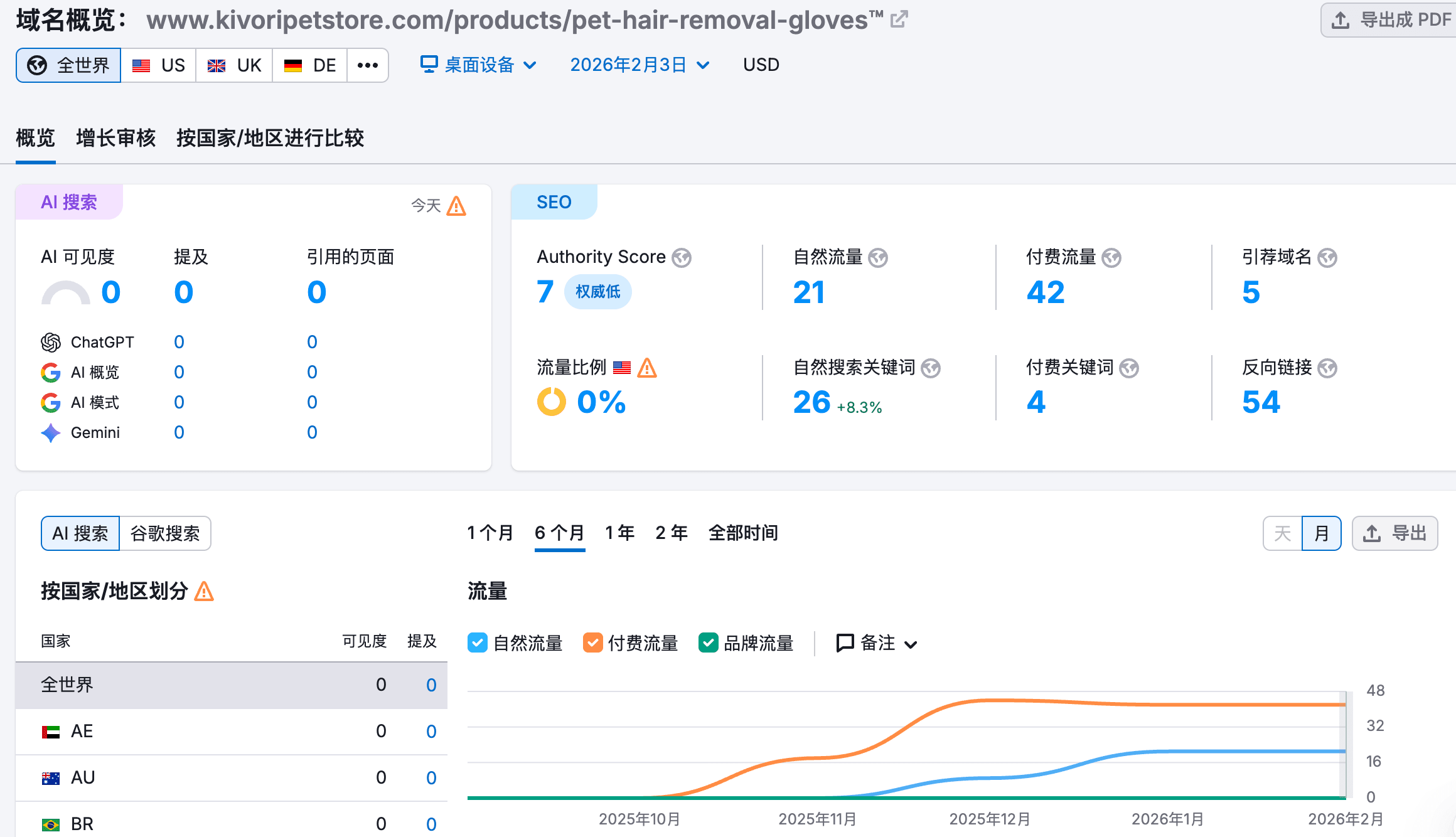 再来看看其在 semruch 上的表现,数据非常低迷,因为 Semrush 的核心机制是基于关键词搜索推算。如果一个卖家的流量都不经过 Google 搜索框进入网站,那么在 Semrush 的眼里,这个网站就相当于是没有人访问的。
