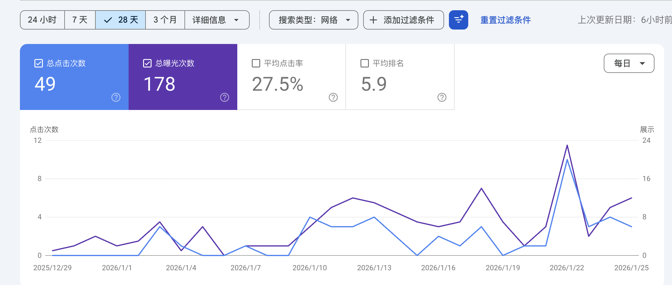 这个工具可以帮助你了解你的网站在整个 Google 搜索引擎里的表现情况,它会告诉你Google 是否收录了你的网页;你的网站在 Google 搜索里排第几名;大家搜什么词找到了你,如下图: