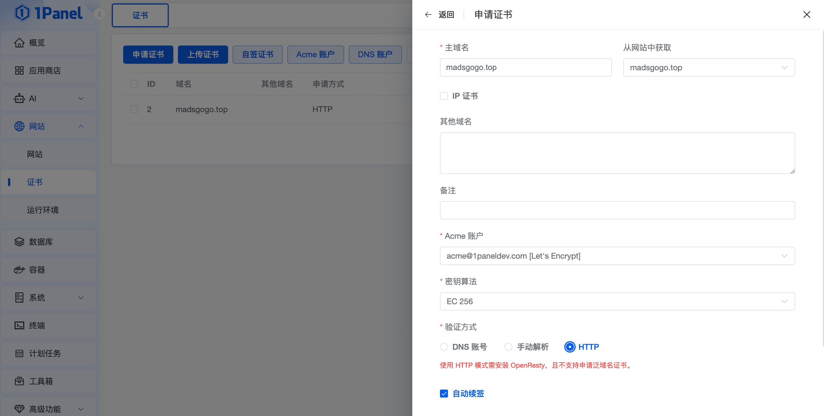- 在 1Panel 首页的左侧边栏点击网站→证书→申请证书,设置如下: