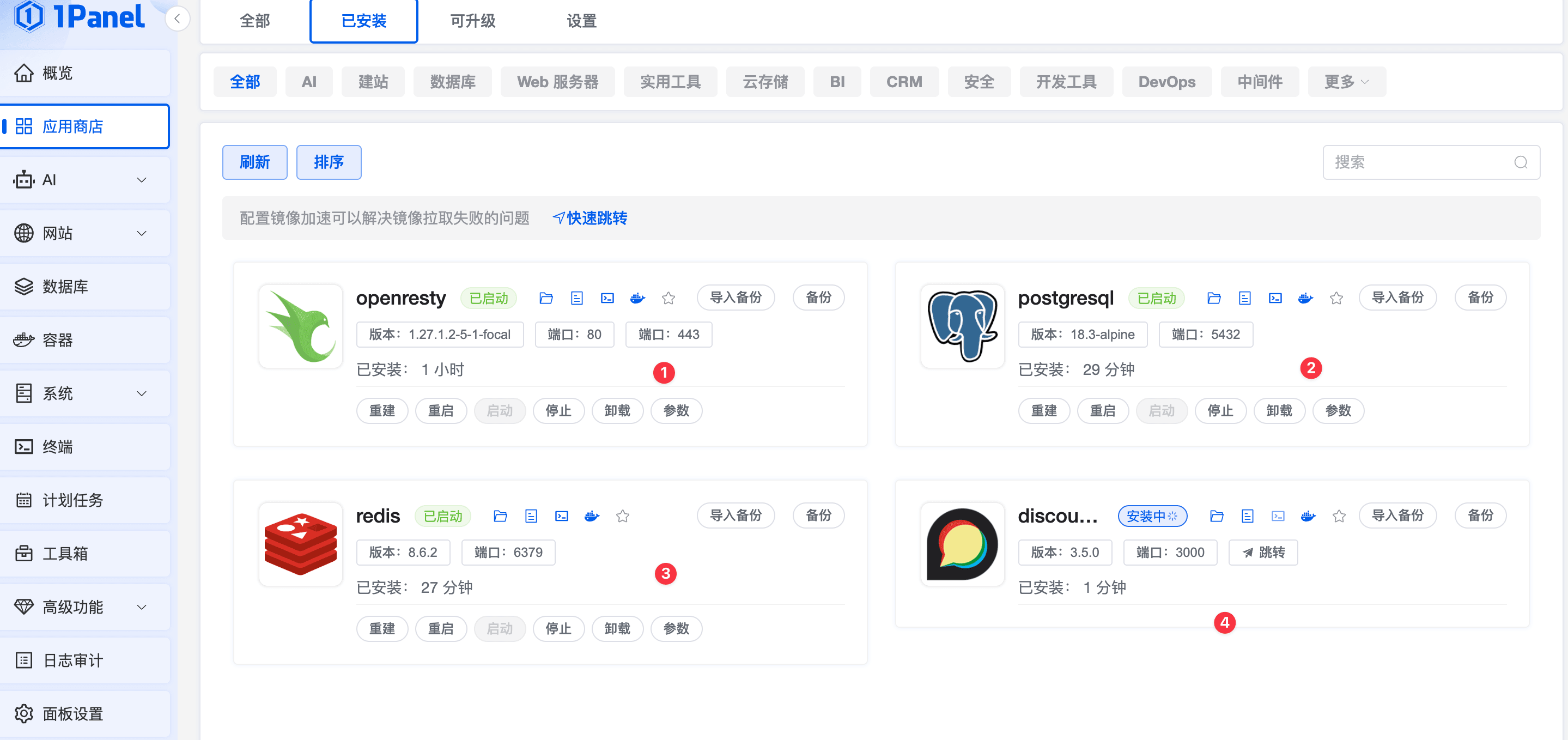 进入到 1Panel 面板后,按照如下顺序安装,安装的时候都选择默认设置即可,其中 Discourse 的访问域名,填写你自己为论坛准备的主域名,例如我就是 madsgogo.top