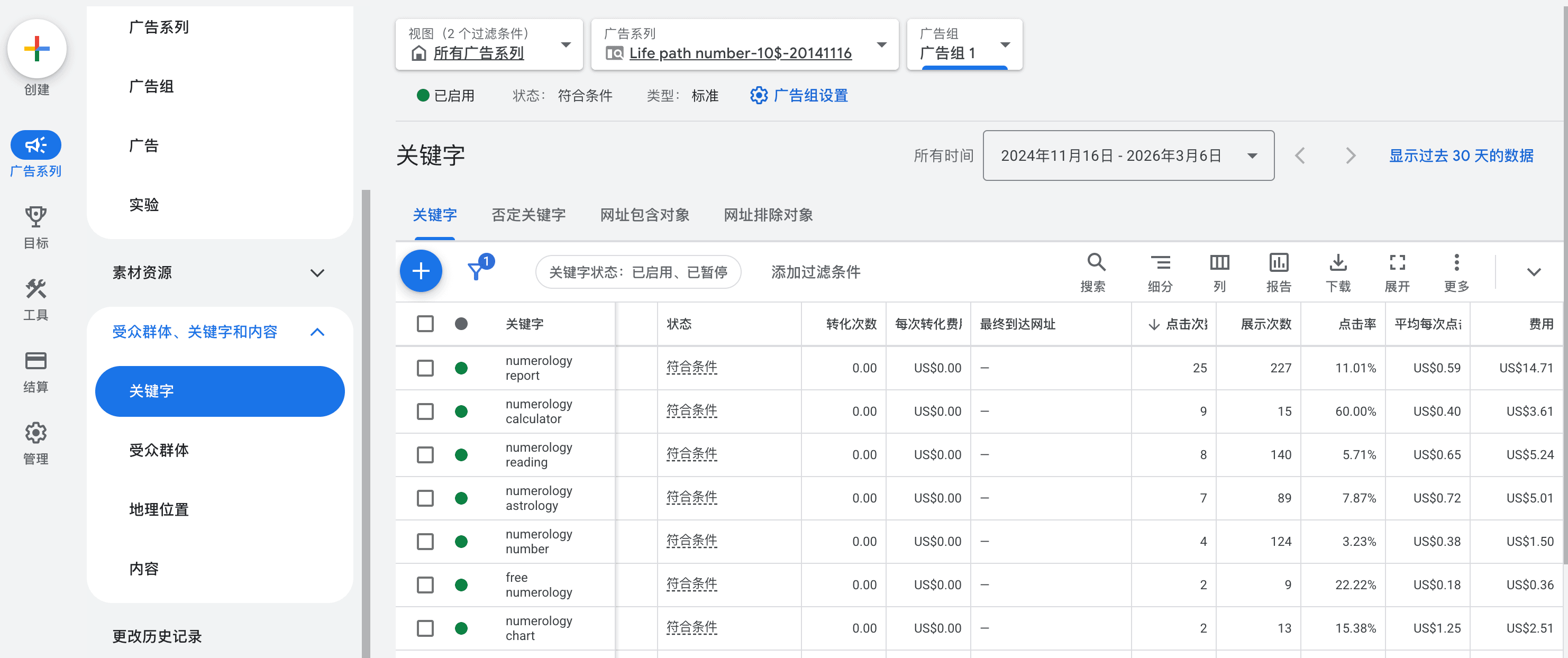 我之前在做 Media Buy 的时候,投放过一次的Google Ads 广告,上方是广告的后台,当时投放的为一个纯关键词的搜索广告,但Google 目前绝对不止这么一点能耐,它还有购物广告(Shopping Ads),展示广告(Display Ads),效果最大化广告(PMax)