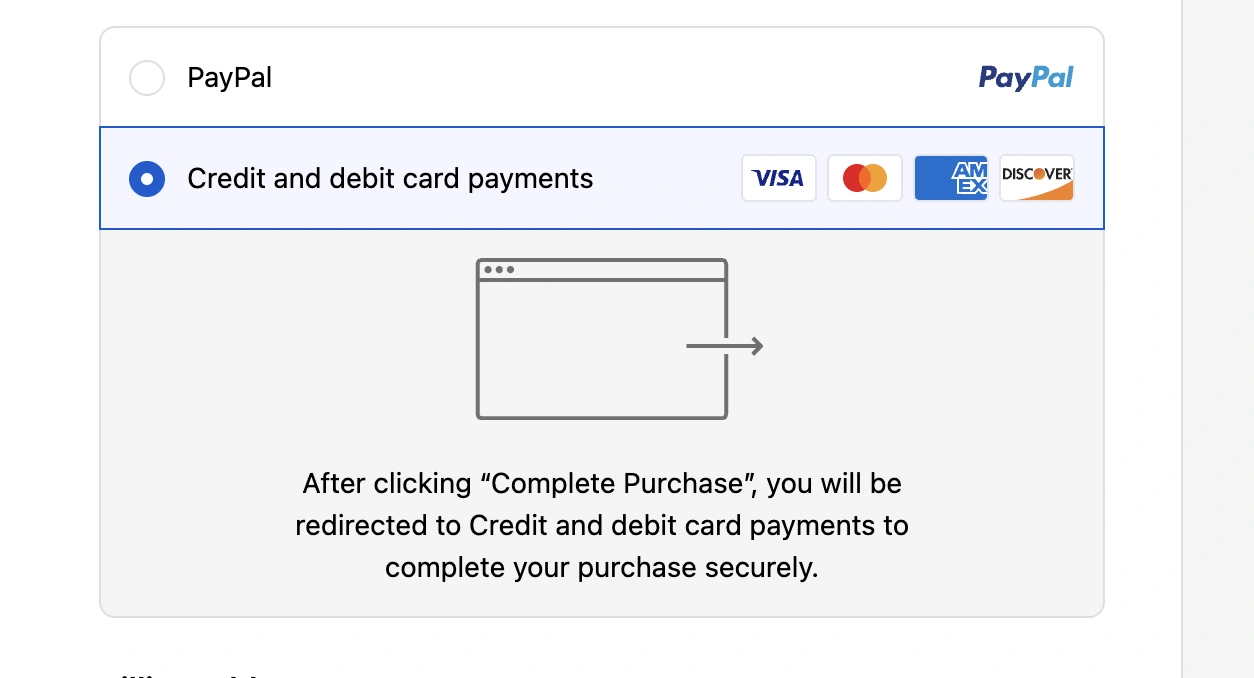 当我们完成添加 PayPal 后,页面只会出现第一种收款方式,也就是用户在付款的时候会强制跳转到 PayPal 的页面。会出现以下两种情况: