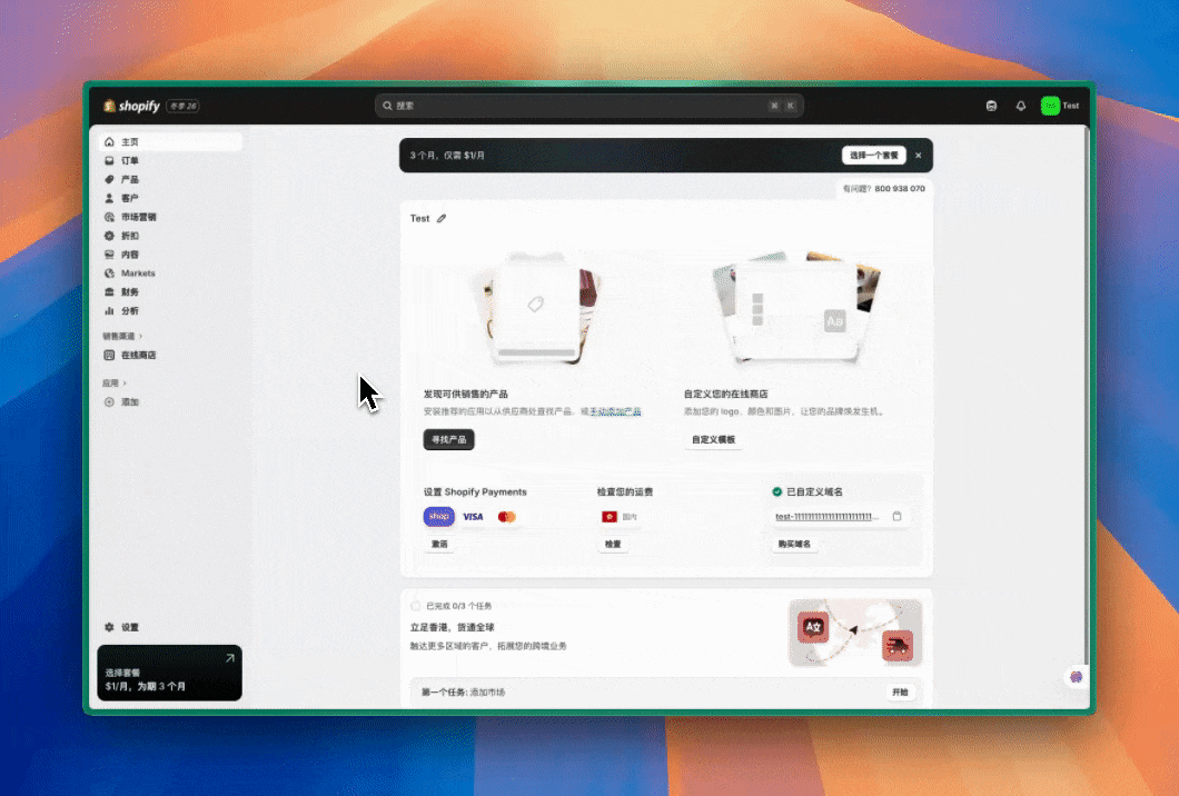 注册时,信用卡绑定阶段可以跳过,有免费 3 天的试用时间,在这个免费的期间,无法解锁商店,也就是说无法对外公开,需要绑定一个信用卡支付 1 美金才行,前 3 个月都是 1 美金的价格,非常划算。在整体的选择上,选哪个影响不大,按照自己的实际需求选择即可,进入到商店后台。